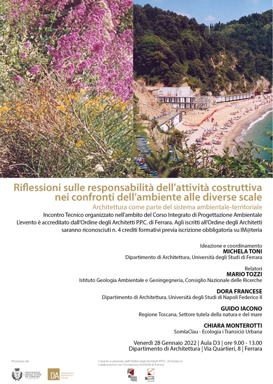 L'incontro Tecnico del 28.01.2022 è la prima iniziativa del DA che riprende dopo la Pandemia il progetto iniziato di IT negli anni precedenti, con l’obiettivo di valorizzare la presenza del Dipartimento di Architettura nel territorio ferrarese, offrendo un punto di contatto tra studenti, professionisti e soggetti invitati. L’iniziativa è attuata nell’ambito del Corso Integrato di PA; si rivolge: - agli studenti del Corso Integrato di Progettazione Ambientale dell’AA 2020/2021 e dell’AA 2021/2022; è aperta contemporaneamente a professionisti interessati. Rappresenta un contributo alla ripresa di attività culturali e di approfondimento tecnico in presenza, fondamentali per una formazione dei giovani progettisti che non si limiti all’acquisizione di competenze puntuali, ma che trovi la capacità di spaziare in molteplici direzioni, utili anche per il lavoro che si può sviluppare.