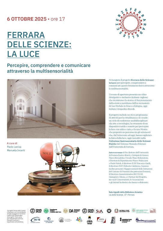 Si inaugura il progetto Ferrara delle Scienze: la Luce per percepire, comprendere e comunicare questo fenomeno fisico attraverso la multisensorialità. L’evento di apertura presenta un video divulgativo e inclusivo (italiano-inglese) che ricostruisce la storia e il funzionamento della storica meridiana dell’ex monastero di San Michele in Bosco a Bologna, oggi Istituto Ortopedico Rizzoli.